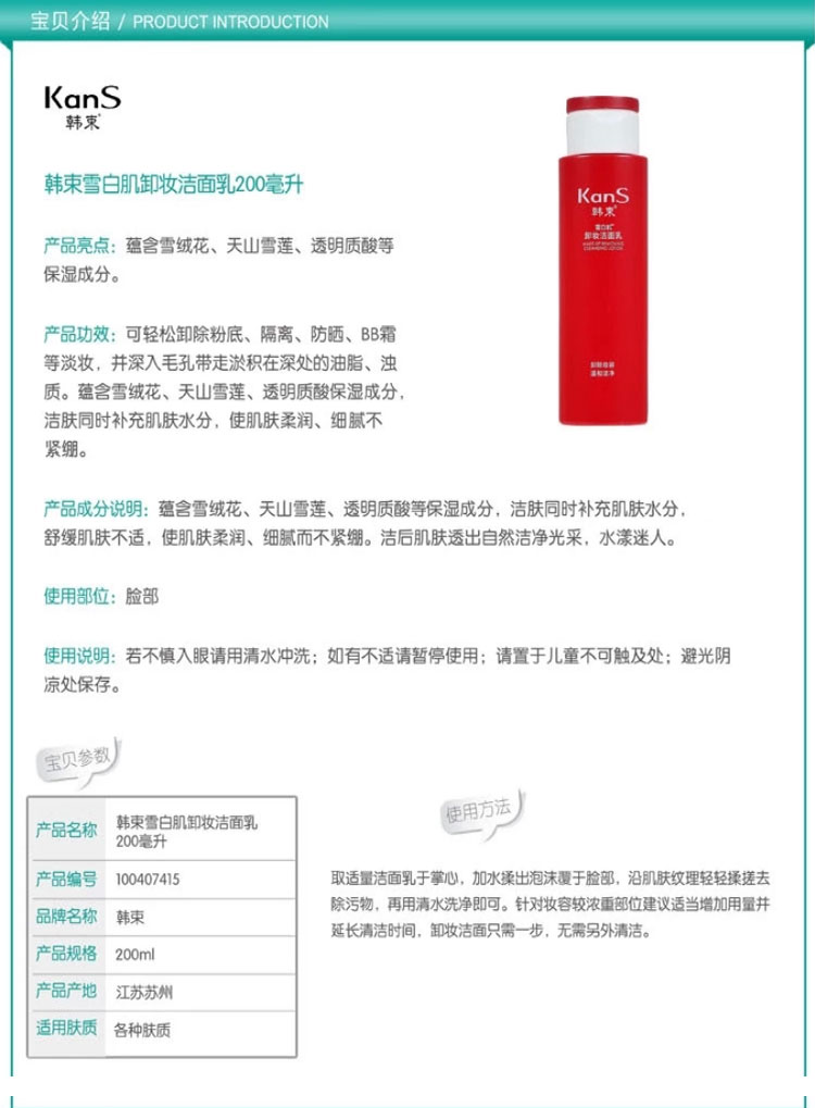 韩束雪白肌卸妆洗面奶200毫升洗面奶深层清洁