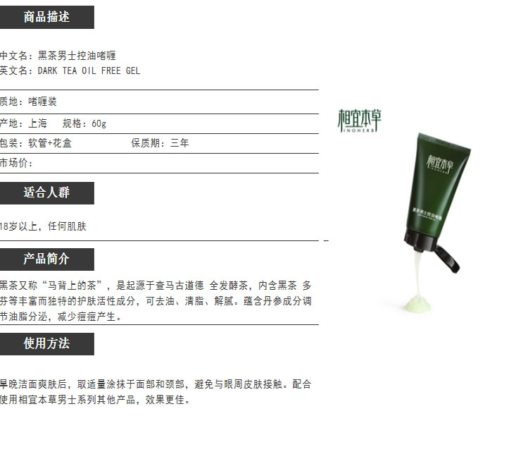 相宜本草黑茶男士控油啫喱60g 补水保湿乳液面霜清爽