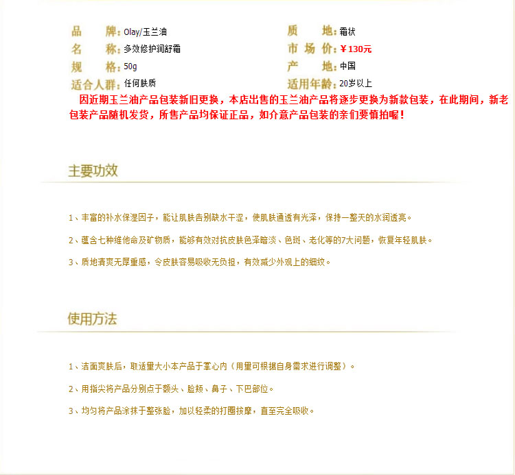 玉兰油多效修护霜50g 抗皱淡斑 美白保湿 七重 面霜