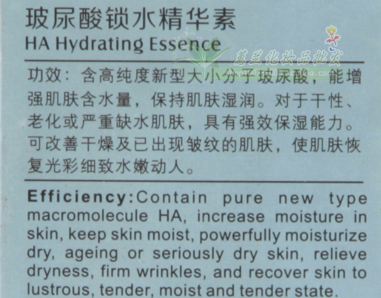 功效:含高纯度新型大小分子玻尿酸、能增强肌肤含水量,保持肌肤湿润,对于干性、老化或严重缺水肌肤,具有强效保湿能力。可改善干燥及已出现皱纹的肌肤,使肌肤恢复光彩细致水嫩动人。