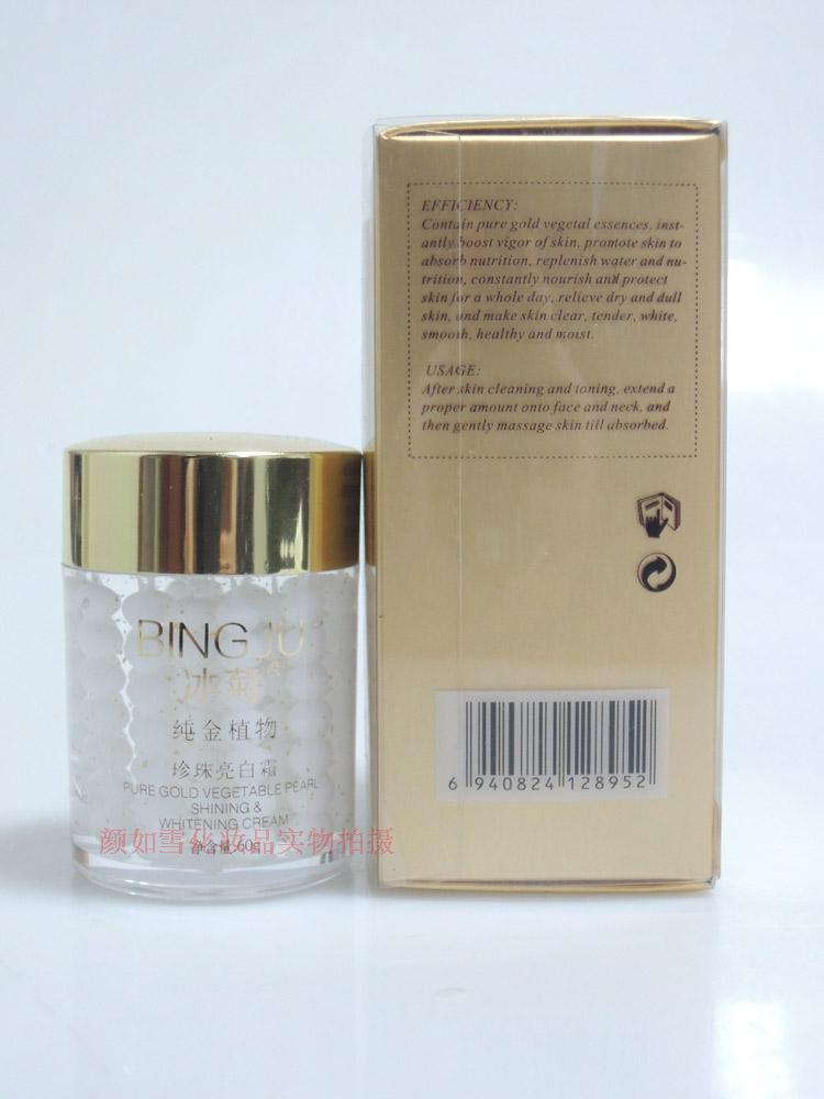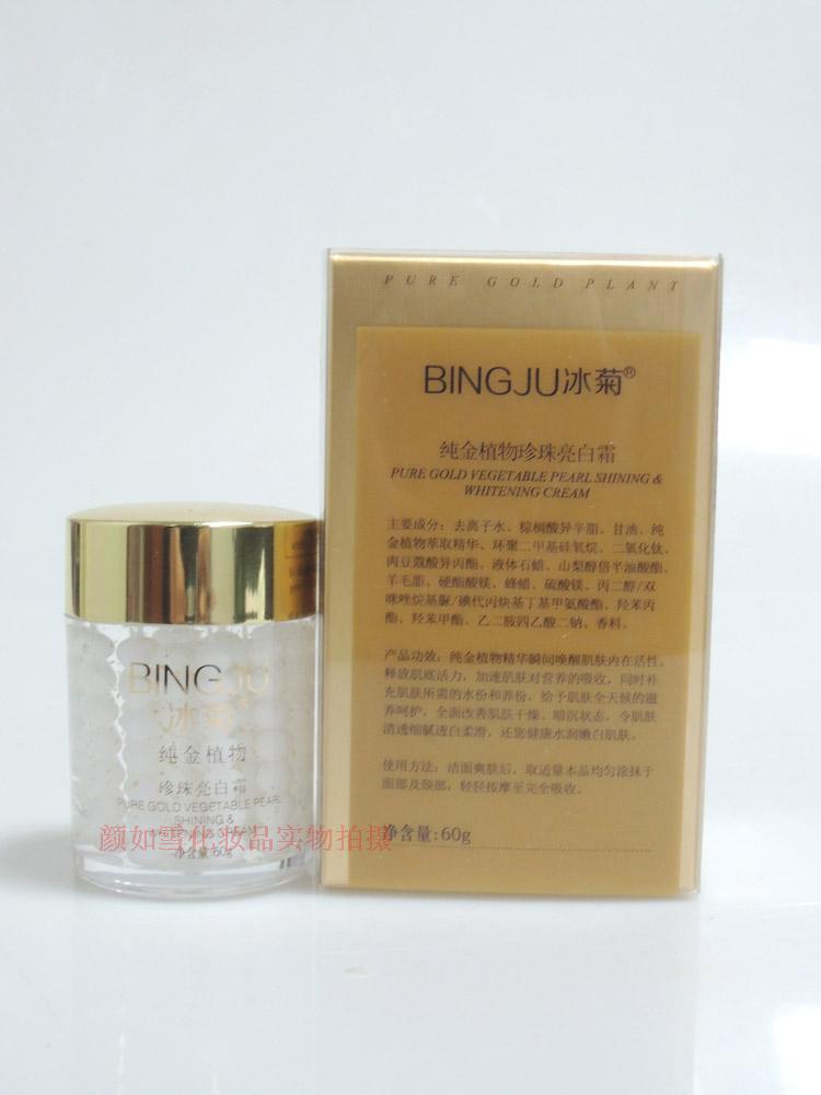 冰菊 纯金植物珍珠亮白霜 60g 产品功效:纯金植物精华瞬间唤醒肌肤内在活性,释放肌底活力,加速肌肤对营养的吸收,同时补充肌肤的水份和养份,给予肌肤全天候的滋养呵护,全面改善肌肤干燥、暗沉状态,令肌肤清透细腻透白柔滑,还您健康水润嫩白肌肤。
