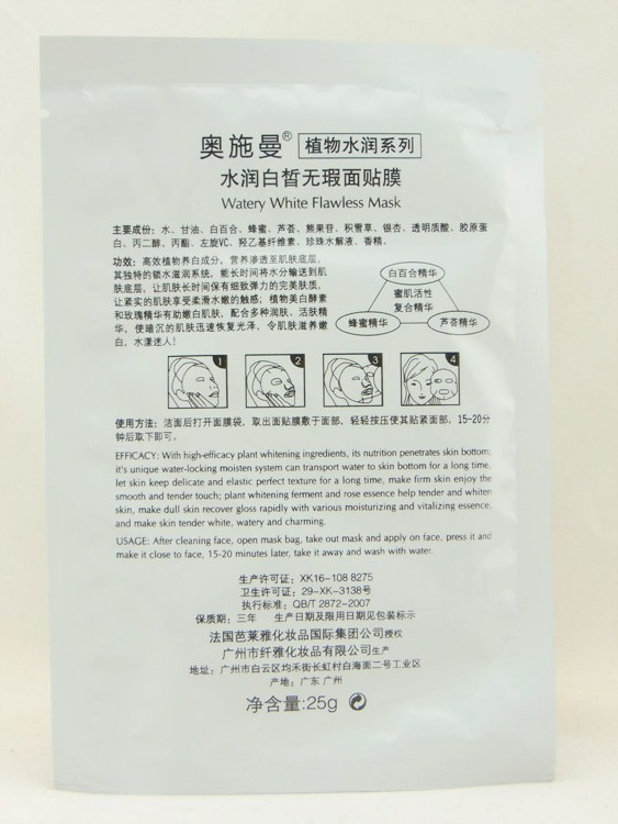 成份:熊果苷(URA)阻黑剂、天然增白元素、甘草、紫云英、珍珠和茯苓、芦荟等多种天然植物精华