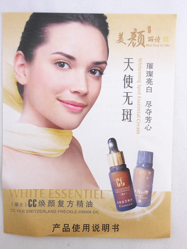【使用方法】1、早晚各一次,正常洁面后,将适量CC焕颜祛斑精油滴至掌心,均匀涂抹于脸部、颈部,重点按摩色斑部位,直至全部吸收。