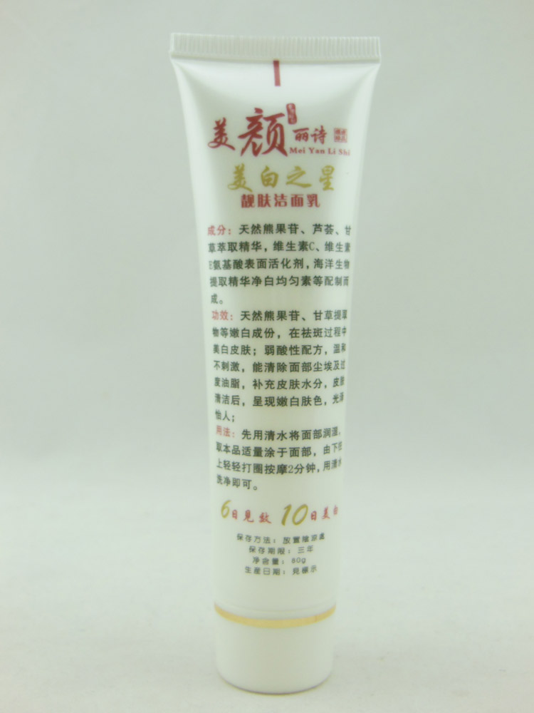 美白靓肤洁面乳 80G 成分天然熊果苷、芦荟、甘草萃取精华,维生素C、维生素E氨基酸表面活化剂,海洋生物提取精华净白均匀素等配制而成。