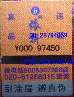 上图是最旧的防伪标签,由于现在假货都搬照旧防伪标签造假,后来厂家统一更换防伪标签为黄色底纹,见下图: