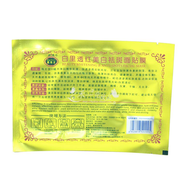功效:每片含30毫升净白精华乳液,快速渗透皮肤底层,淡化及加快黑色素的剥落,有效淡退雀斑、色斑、改善萎黄及不均匀的暗淡肤色,恢复肌肤亮白、健康神采。并蕴含维生素B、天然桑树萃取精华,维他命C,维他命E等纯天然植物精华,能迅速渗透肌肤底层,达到深层滋润的效果,让肌肤充满水份润泽、雪白娇嫩,焕发肌肤明亮光彩,白里透红。