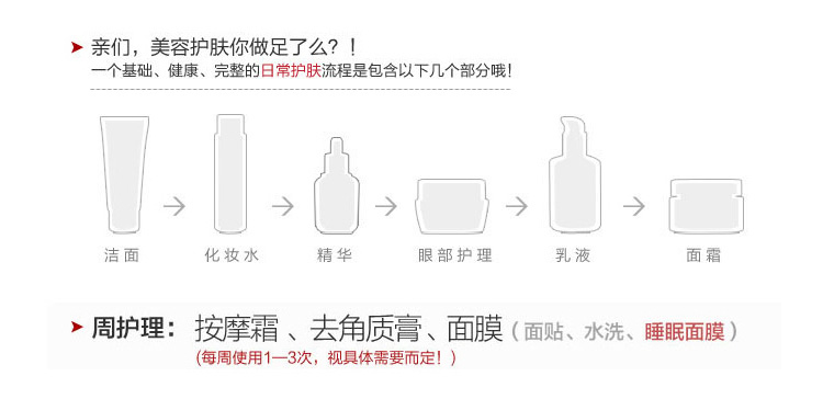 本品蕴含营养物质能快速有效渗透真皮层,从肌肤深层起到活化组织细胞作用,让肌肤得到充分滋润和营养,同时释放特含的保湿因子元素,迅速及时补充肌肤所需水分,用后皮肤细嫩白皙。