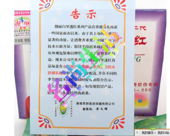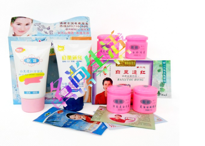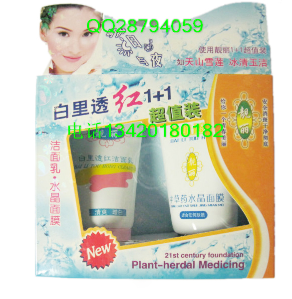 1。美白日霜:20g---- 含有特别白里透红配方,长期使用,使皮肤增白去皱.分解多余黑色素.防止黑斑再生