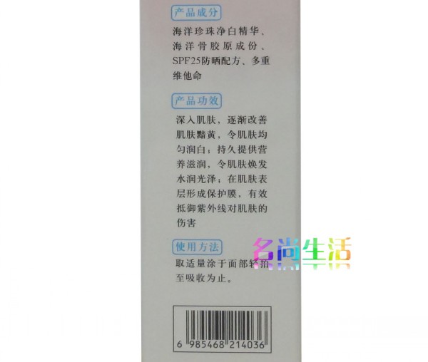 产品成分:海洋珍珠净白精华、海洋骨胶原成份、SPF25防晒配方、多重维他命。