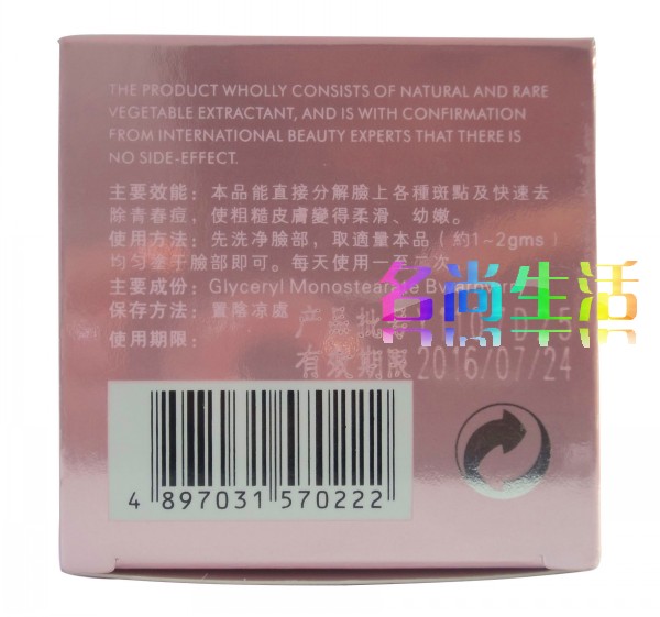 r r本品含有天然增白素(BEARBERRY)以及各种青草植物所提炼的营养激素,配合抗菌素、消炎酵素多种维他命调配而成具有双重增白因子,直接分解去除已经形成的黑斑、雀斑、各种斑点以及被细菌所感染而成的面疱,并能渗入深层皮下组织治疗潜伏的面疱与分解黑色素达到增白的完全效果。另本品含有防晒因子,能抵抗有害阳光紫外线之UVA及UVB,使皮肤更美白、健康。