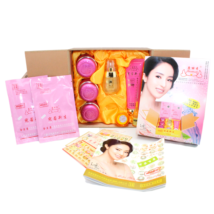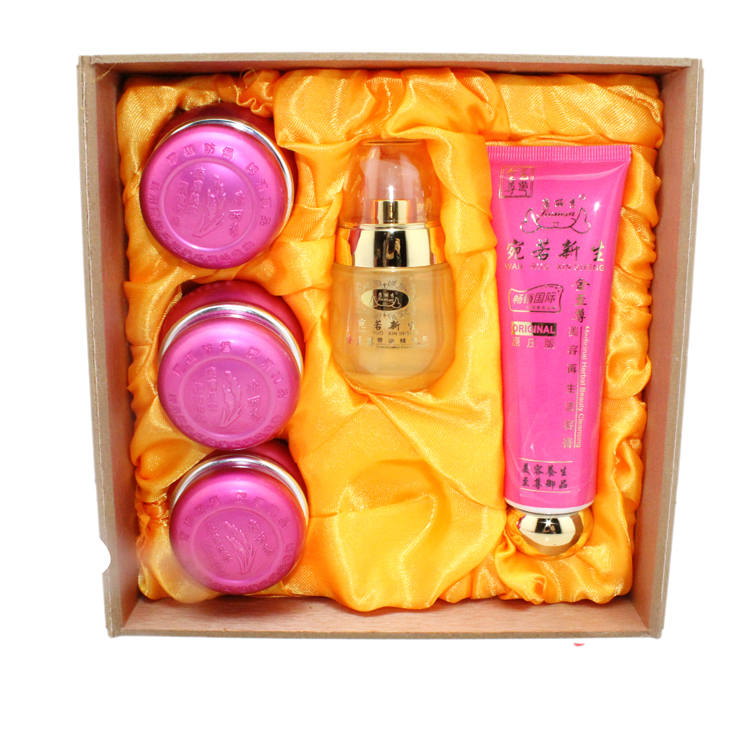 本品全称为康丽秀宛若新生金至尊美容再生五宝,由A日霜、B珍珠霜、C晚霜、二片面膜、精华、防护霜、洗面奶组成