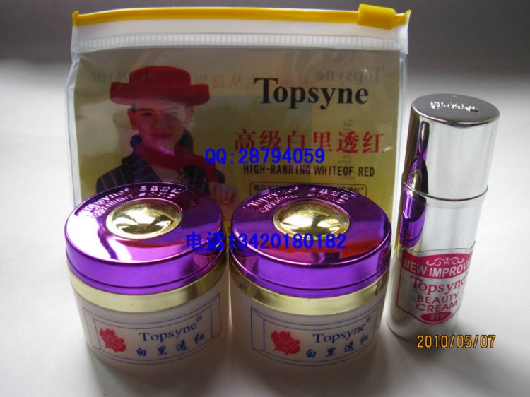 高级白里透红祛斑本品有增白、祛斑、去皱、润肤、活化肌肤、消除黑色素的功效。使肌肤白里透红,柔顺光滑,有弹性。主要成份:内含植物精华素,有芦荟、花粉、珍珠、人参、果酸(AHA)等成份。用法:晚上用红色膏体,早上用绿色膏体,然后使用美白珍珠膏。使用红色膏体时有发热、发痒、发红或脱皮,属正常现象,一周左右恢复正常,个别反应较强者,停止使用红色膏体即可。